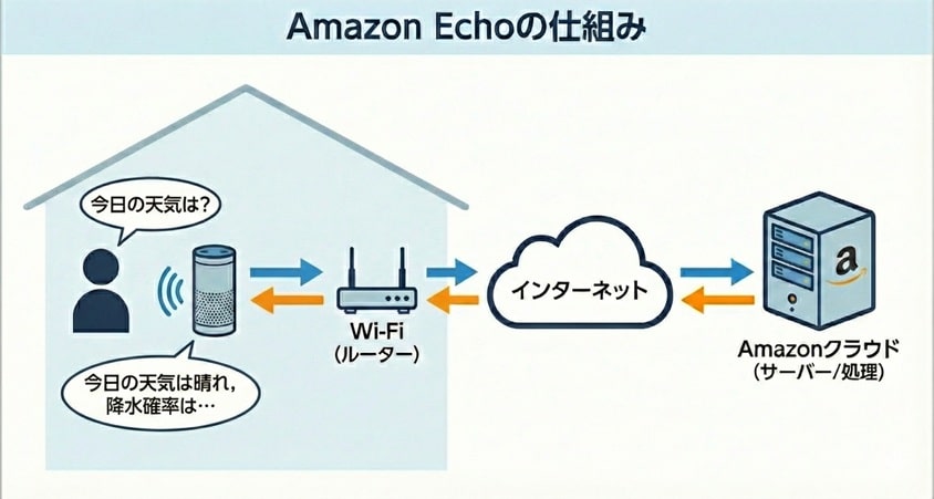 Amazon EchoにはLANケーブルを挿す穴がなく、無線通信で使う製品なのです。
