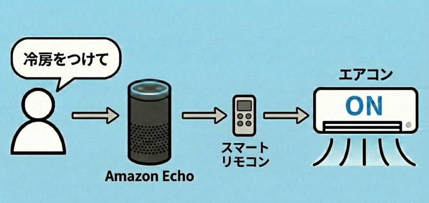 「アレクサ、エアコンをつけて」「照明を暗くして」など、これだけでOK。