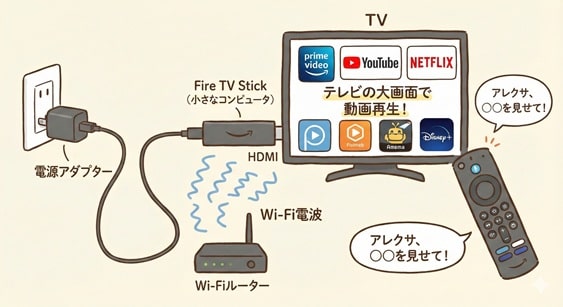簡単に言えば、Fire TV Stickは「テレビにつないで動画配信サービスを視聴するデバイス」です。