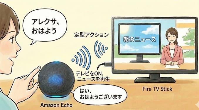 - 「アレクサ、おはよう」 → テレビがONになり、いつものニュース番組が流れる